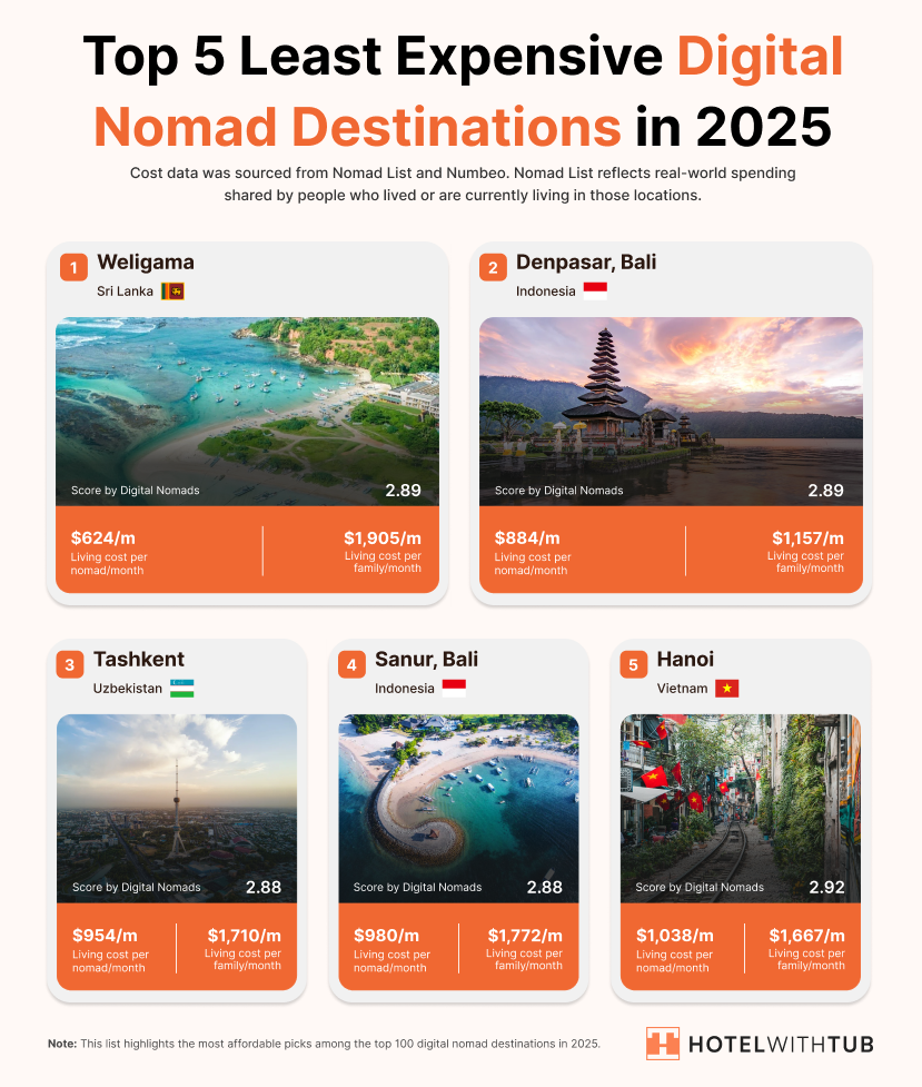 Cost data was sourced from Nomad List and Numbeo. Nomad List is a community-driven platform where digital nomads share real-world insights, including cost of living, quality of life, and remote work experiences. It reflects spending patterns reported by people who have lived or are currently living in each location.
